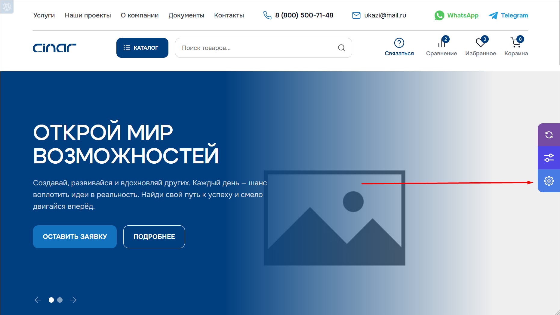 Для начала работы с редактором найдите кнопку с шестерёнкой в правой части экрана. Кнопка расположена вертикально и всегда видна при просмотре страницы.