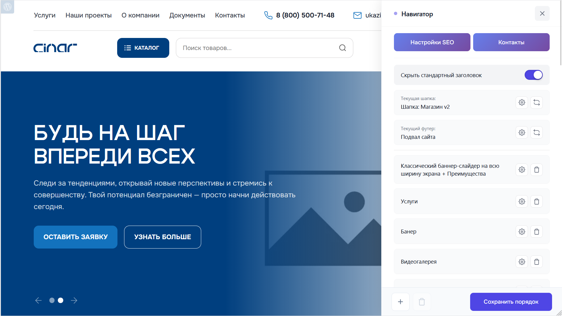 - Текущая шапка — показывает название активной шапки сайта (например, «Шапка: Магазин v2»)