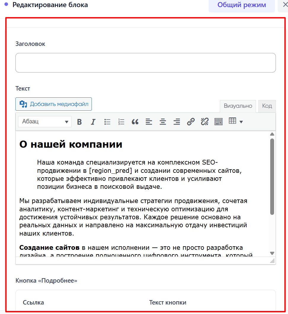 Здесь вы можете корректировать/добавлять контент, содержащийся в вашем блоке, например, тексты, картинки, ссылки на кнопки и т.д.