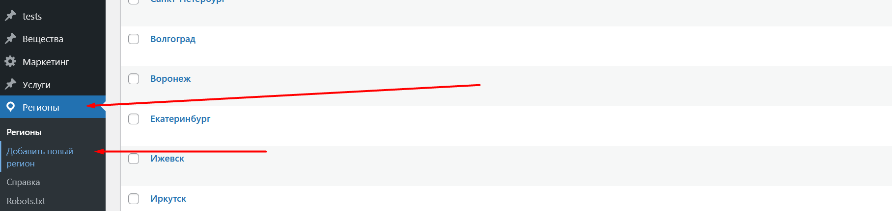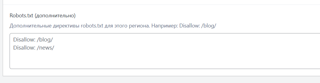 В настройках каждого региона есть поле «Robots.txt (дополнительно)» для индивидуальных директив. Это позволяет задать уникальные правила индексации для конкретного города.