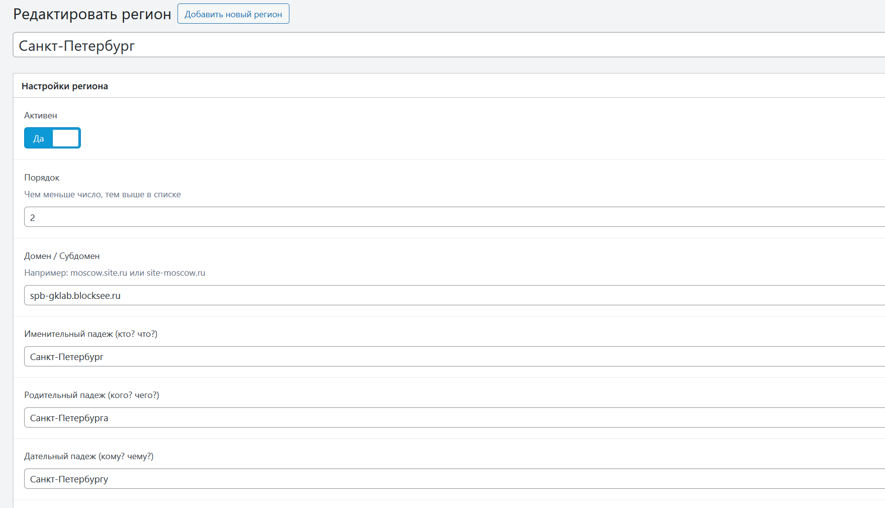 Перейдите в раздел Регионы → Добавить регион и заполните необходимые поля:
