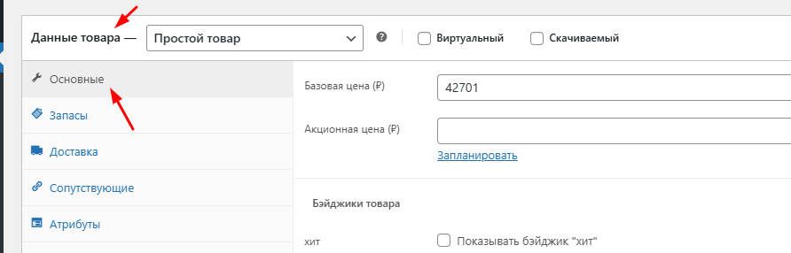 Здесь можно задать как базовую цену для товара, так и акционную + запланировать сроки действия акционной цены в формате с-по
