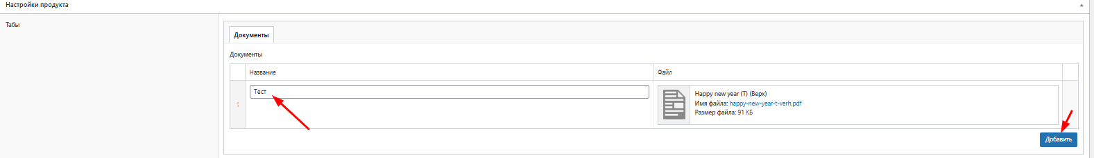 Здесь вы можете добавить документы для каждого конкретно товара и задать для них названия: