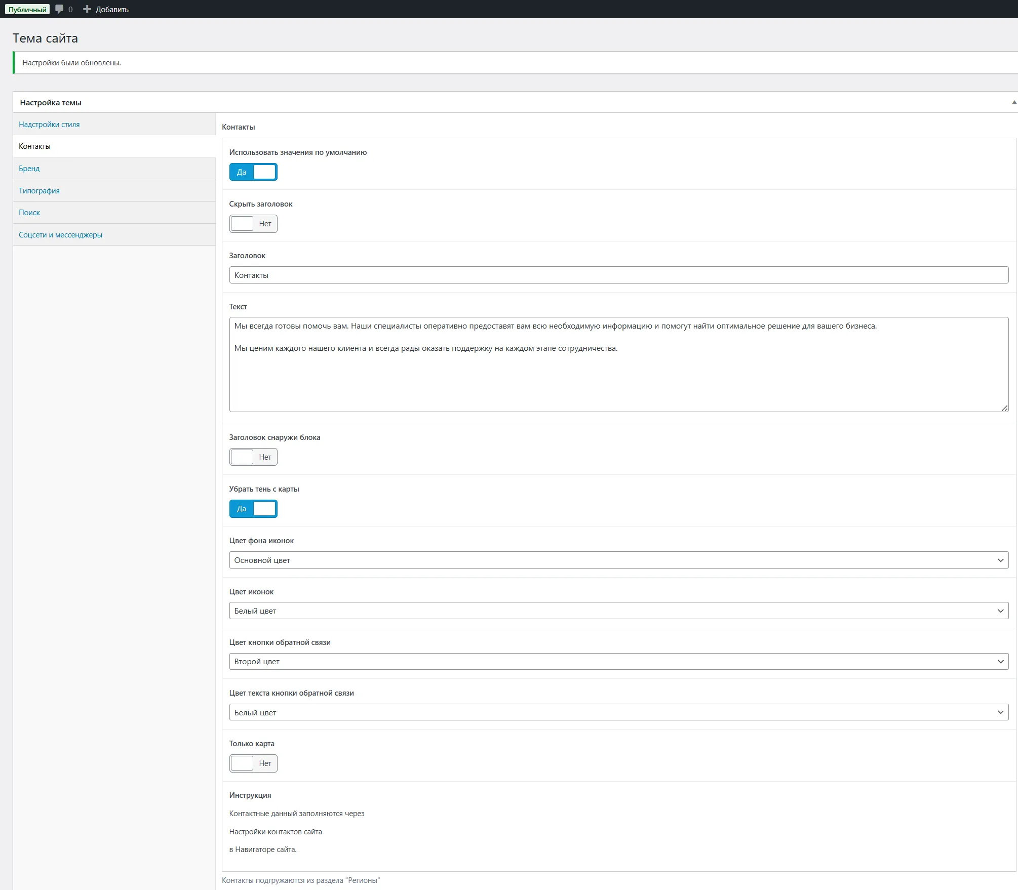 Содержит контентные и визуальные настройки для одноименной страницы. ВАЖНО! Саму информациу со страницы - телефоны, адреса, почты и тд можно вносить и изменять в разделе Регионы, подробнее тут.