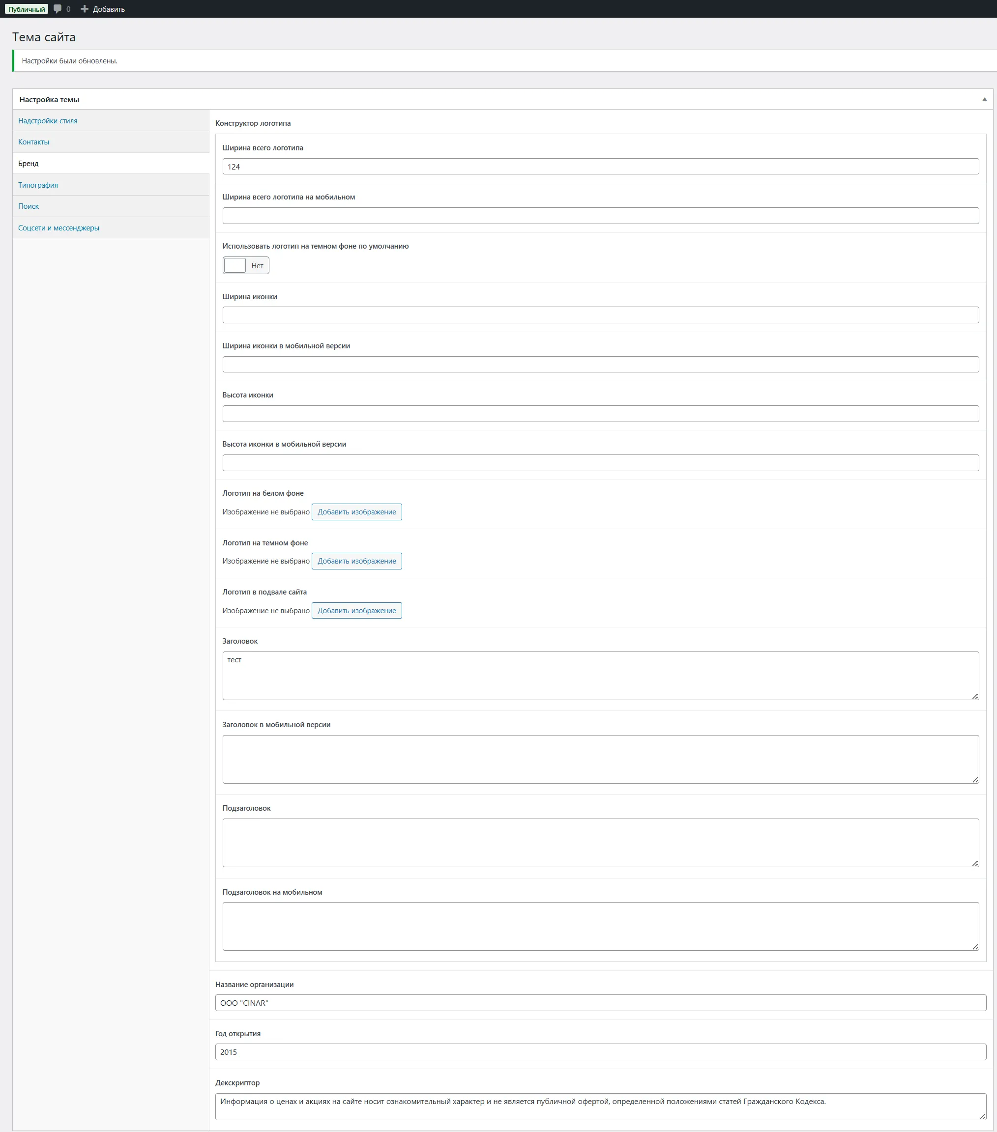 Содержит настройки для логотипов сайта, заголовков и текстов рядом с ними, а так же название организации и текст дескриптора в подвале.