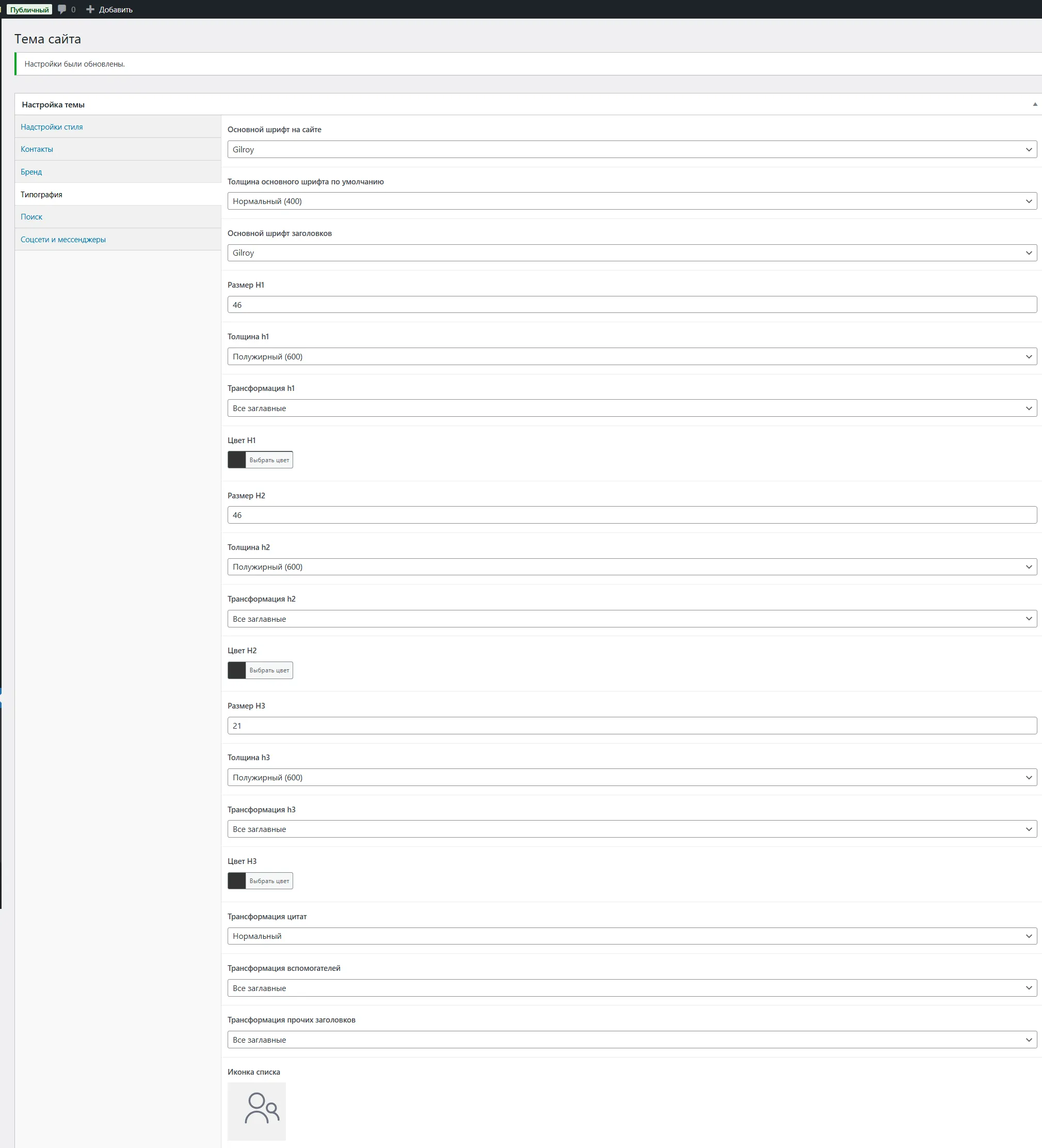 Здесь находятся визуальные настройки темы сайта. Можно задать цвета для текста, кнопок, размеры шрифта элементов и т.д.