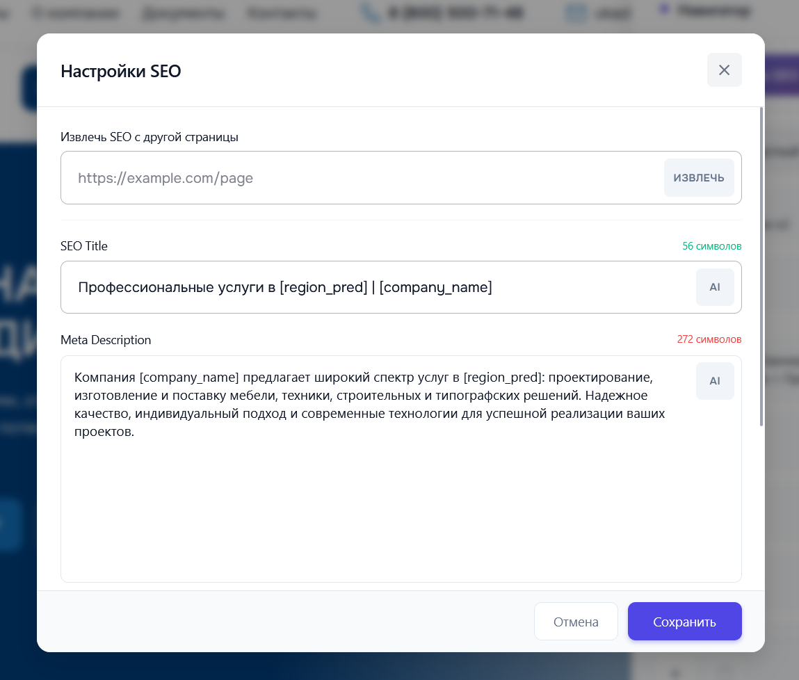 - Кнопка «AI» — автоматическая генерация описания на основе содержимого страницы